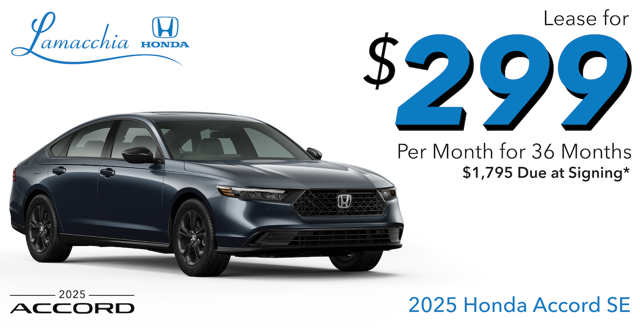 *Includes down payment, no security deposit required; excludes tax, title, license and dealer fees. For well-qualified customers. Annual Miles 10,000. Expiration Date 03/02/2026. Available only for residents of NY. Offer excludes accessories and premium paint color. Closed-end lease for 2025 Accord 1.5T SE available through 03/02/2026, to approved lessees by Honda Financial Services in select states only. MSRP $31,755.00 (includes destination; excludes tax, title, license, registration, options, insurance). Actual net capitalized cost $26,688.21. Total monthly payments $10,764.00. Option to purchase at lease end $19,053.00. Lessee is responsible for maintenance, excessive wear/tear, and up to 20¢/mi. over 10,000 miles/year. Dealer participation may affect actual payment. Dealer sets actual prices.