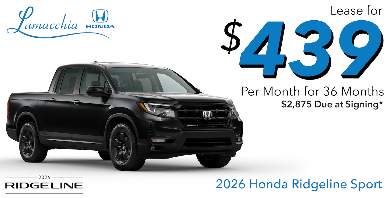 *Includes down payment, no security deposit required; excludes tax, title, license and dealer fees. For well-qualified customers. Annual Miles 10,000. Expiration Date 03/02/2026. Offer excludes accessories and premium paint color. Closed-end lease for 2026 Ridgeline AWD Sport available through 03/02/2026, to approved lessees by Honda Financial Services. MSRP $42,545.00 (includes destination; excludes tax, title, license, registration, options, insurance). Actual net capitalized cost $39,631.21. Total monthly payments $15,804.00. Option to purchase at lease end $27,654.25. Lessee is responsible for maintenance, excessive wear/tear, and up to 20¢/mi. over 10,000 miles/year. Dealer participation may affect actual payment. Dealer sets actual prices. See participating dealers for details.